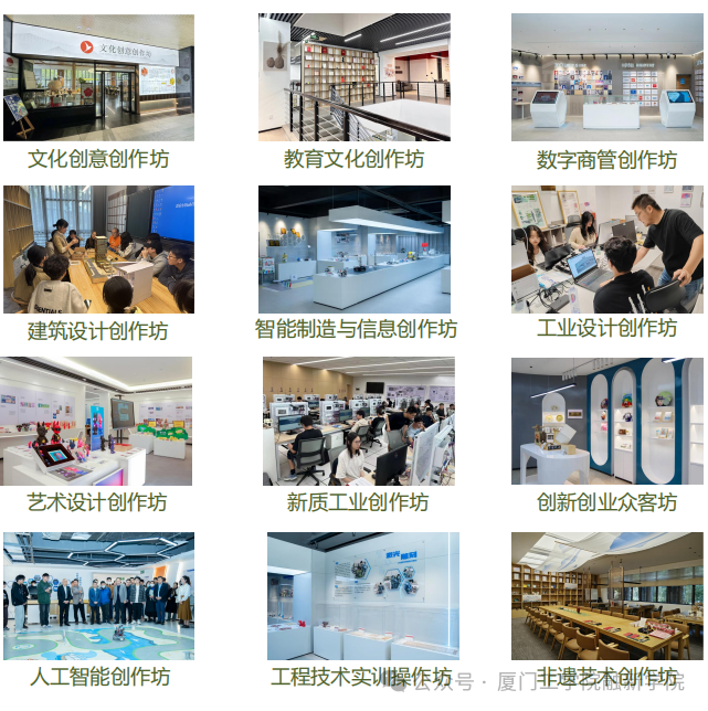 十二坊:文化创意创作坊、教育文化创作坊、数字商管创作坊、建筑设计创作坊、智能制造与信息创作坊、工业设计创作坊、艺术设计创作坊、新质工业创作坊、创新创业众客坊、人工智能创作坊、工程技术实训操作坊、非遗艺术创作坊。