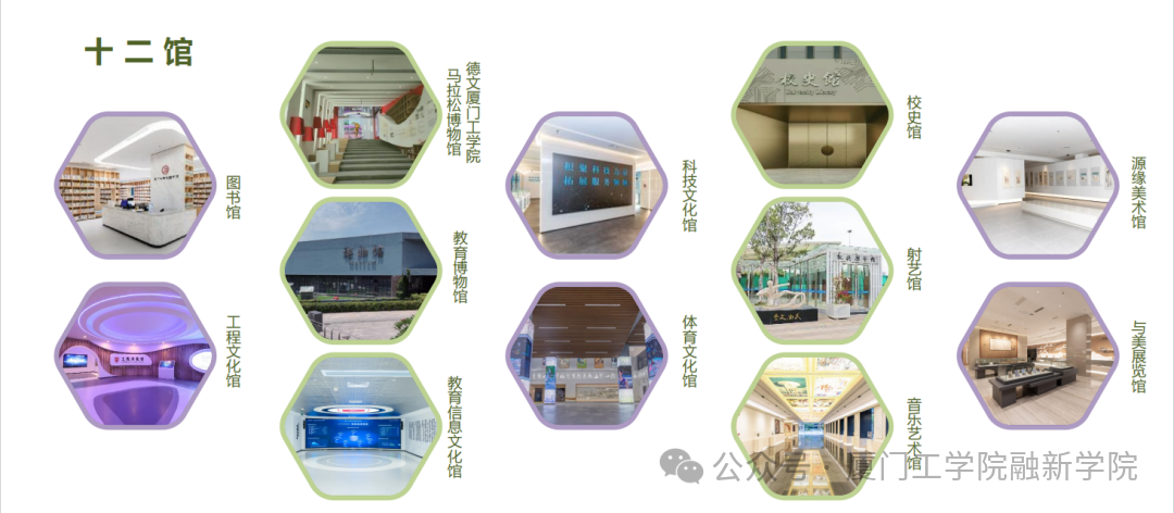十二馆:图书馆、校史馆、教育博物馆、科技文化馆、工程文化馆、教育信息文化馆、与美展览馆、源缘美术馆、音乐艺术馆、体育文化馆、马拉松博物馆、射艺馆。