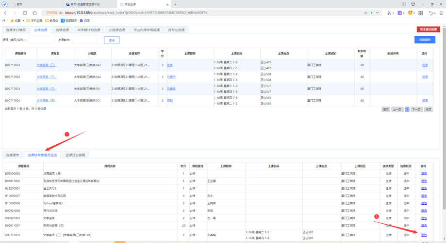 4.点击【必修选课】,进入选课体育选课页面,按个人需求,选择对应的班级。选课完成后查看【选课课表】确定是否 选上。