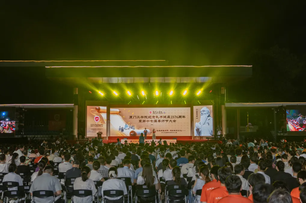 2025年9月28日晚,厦门工学院纪念孔子诞辰2576周年暨第十七届“尊师节”活动在一号运动场举办。厦门工学院李德文董事长,苏涵校长,校党委朱瑞元书记,李雄虎副董事长、执行校长,李咏梅副校长,张凯副校长,李文副校长,德文教育集团高管、学校各二级单位负责人、全体教职工以及2025级融新学院全体新生出席活动。