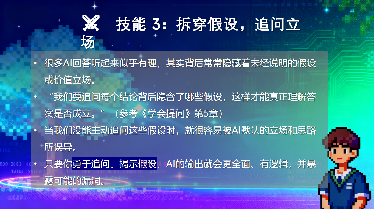 围绕批判性思维指导下的AI提问方法论,李铭佳老师重点讲解了四项核心技能: