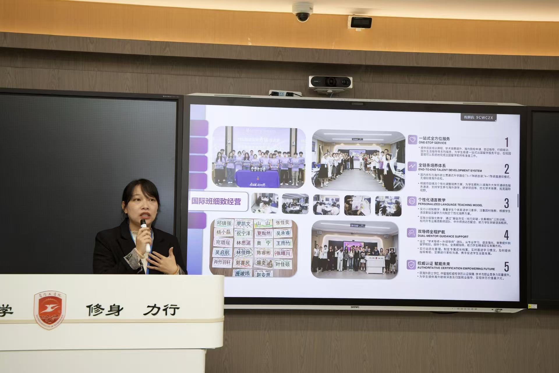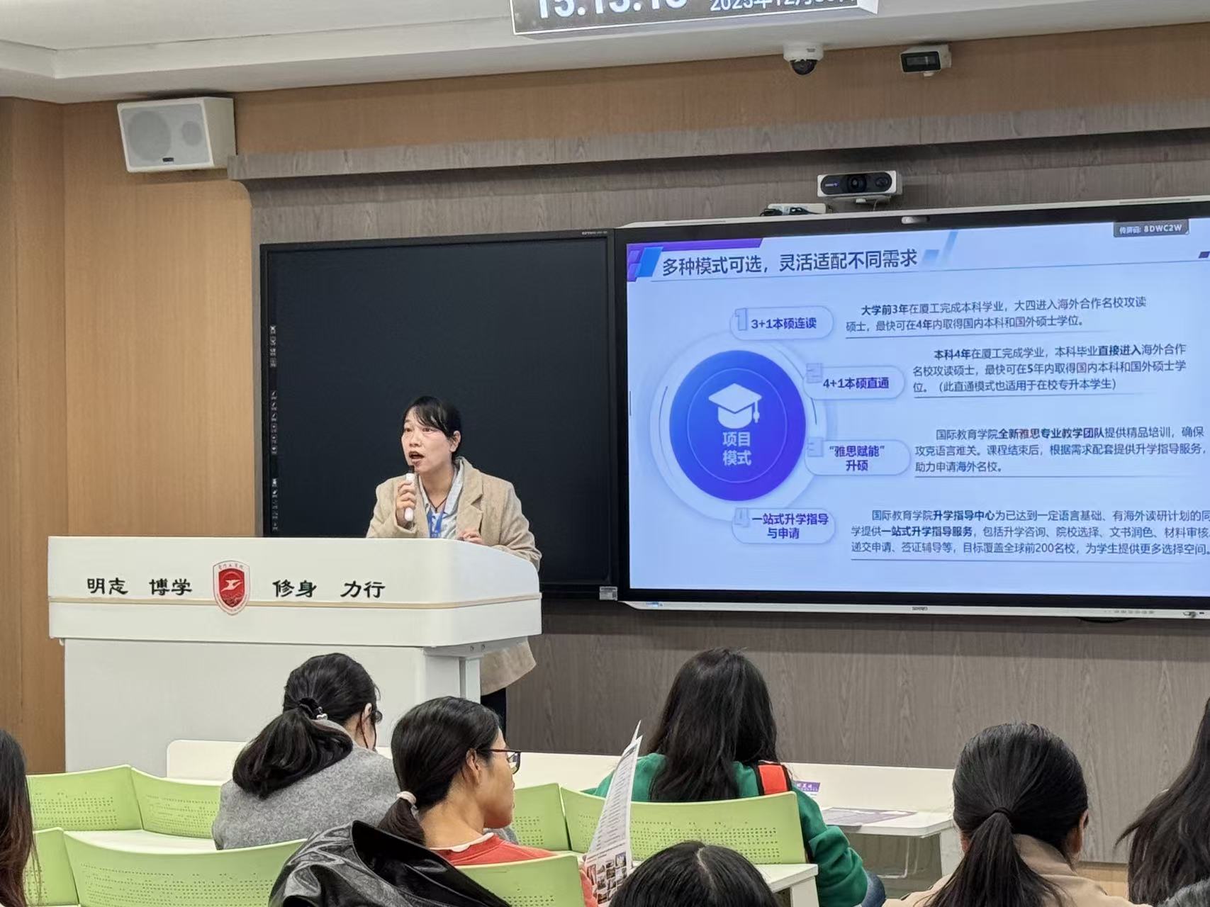 在此背景下,学校推出的“海外读研·本硕直通”项目,为融新学子量身打造了更具优势的学历提升路径。宣讲团队通过图文并茂的形式,系统解读项目核心价值: